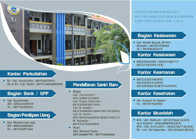 Berikut kami sediakan brosur pendaftaran dan contact person untuk informasi mengenai pendaftaran calon santri baru Ponpes Darullugahah Wadda’wah: